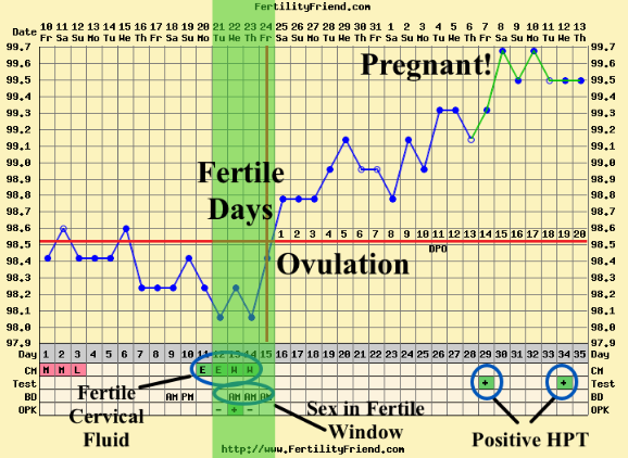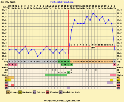 Gemiddeld genomen is je temperatuur na je eisprong ongeveer 0,2 tot 0,3 graden hoger dan voor je eisprong.