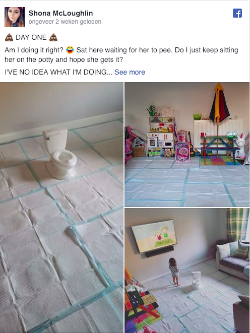 De Britse moeder Shona speurde op het web om info te vergaren over zindelijkheidstraining. De vloer voorzien van een beschermlaagje en het aanschaffen van een schitterend potje leken haar voldoende om de klus te klaren. Met de nadruk op beschermlaagje. Onder het mom; het zekere voor het onzekere liet Shona geen enkele centimeter in haar woonkamer over aan het lot.